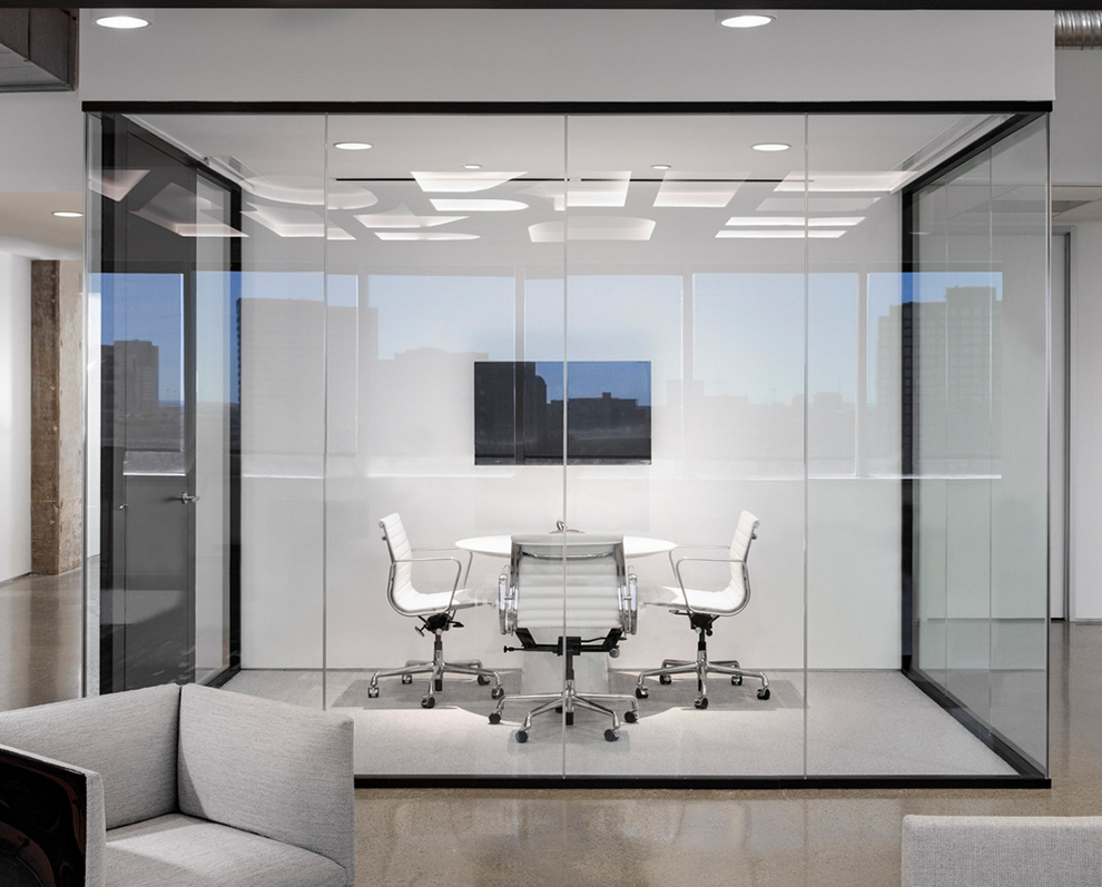חדר ישיבות תחום במחיצות שקופות הפונה לאזור מטבחון וקבלה ומאפשר שליטה מלאה בנעשה במשרד.